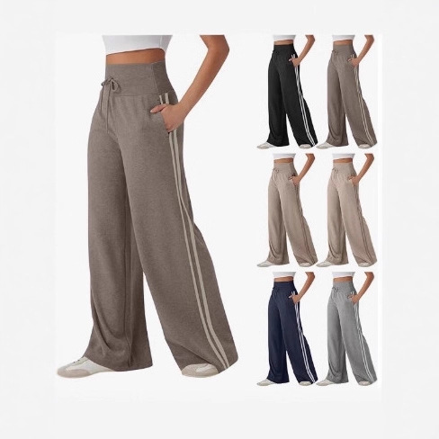 亚马逊欧美跨境女子高腰运动裤宽松侧条纹裤子宽阔腿锻炼休闲裤。