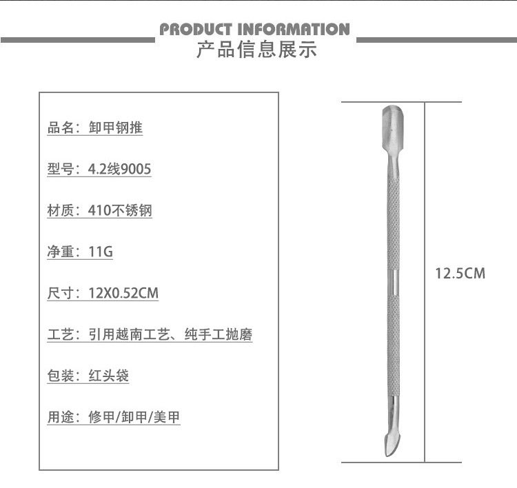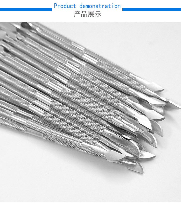 本厂主要生产美容工具五金配件:美甲钢推、死皮剪、鹰嘴钳、美容美甲用具,指甲锉,耳挖,耳勺,美容挑,清洁棒,个人护理用品,美容美甲,各类产品各种规格各种档次,样品齐全,更希望贵客户能来图来样定制产品。