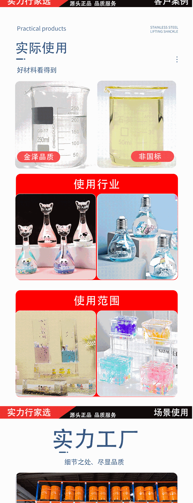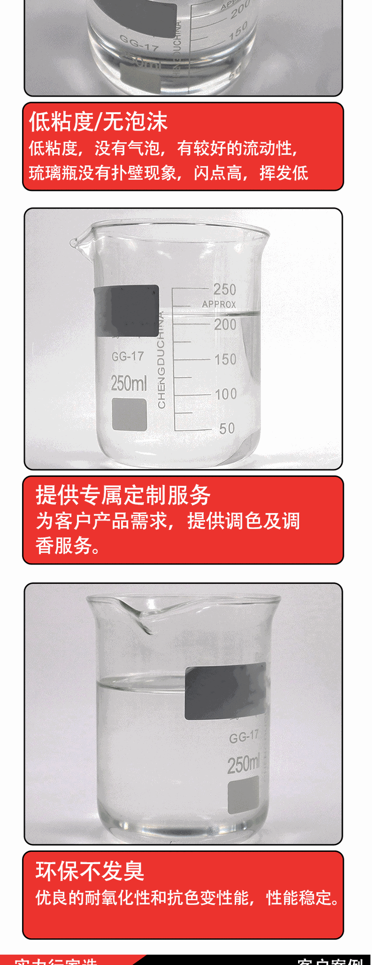 低粘度,没有气泡,有较好的流动性,琉璃瓶没有扑壁现象闪点高,挥发低,制作方便。