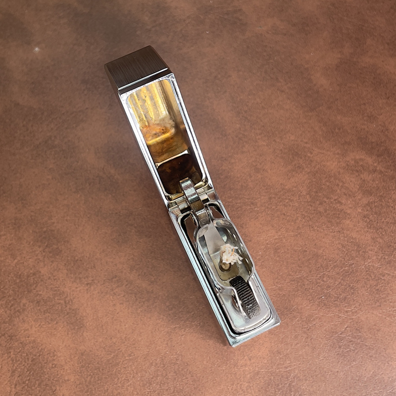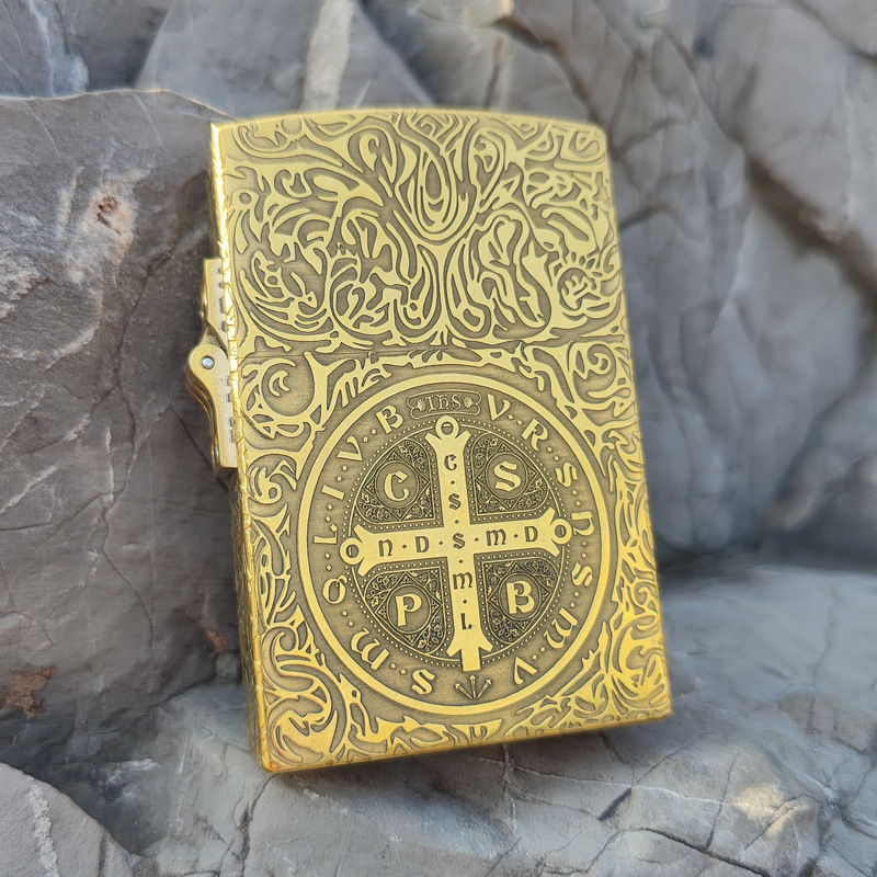 【メーカー直送】正規品の佐羅重鎧の糸を引いたZL7の糸を引くマークの真鍮が灯油ライターをくりぬいています。