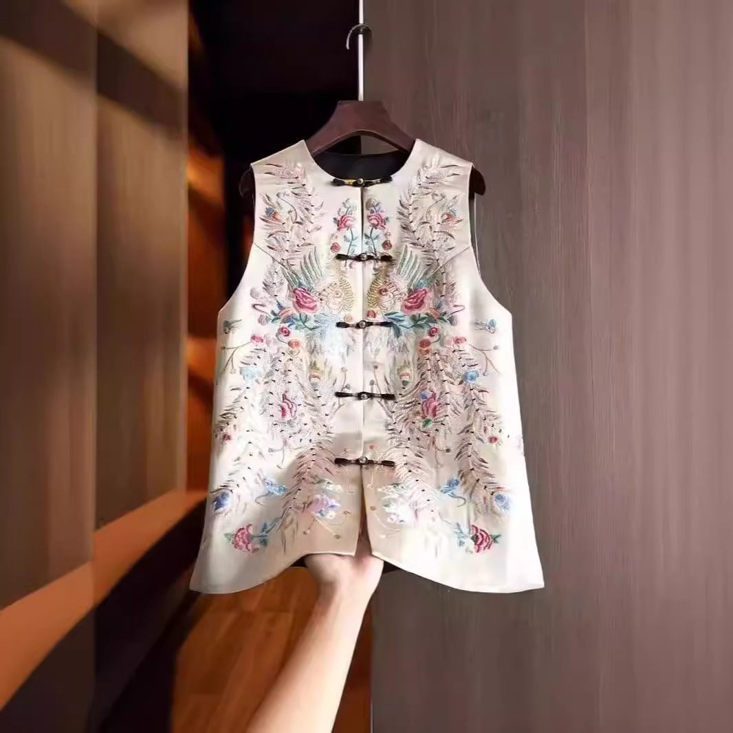 高級感のある重工細工の中国風刺繍ベスト、女性用新作レトロなバックル付き、新中式重ね着ベストトップス