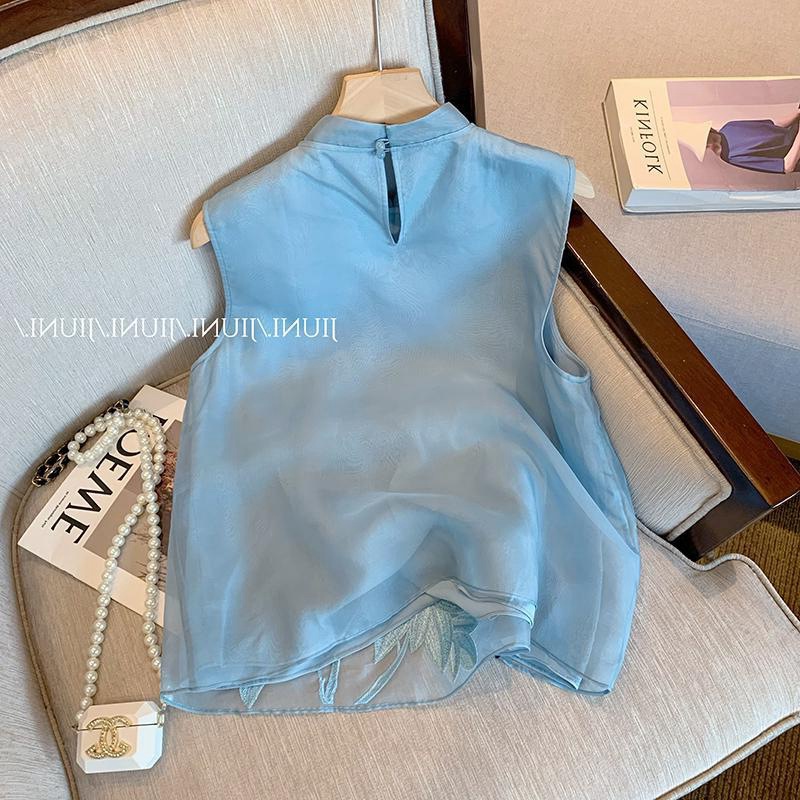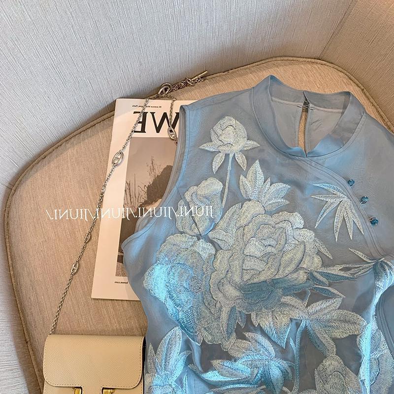 2024年夏の新型の薄いタイプの若いタイプの国風の気質の肩の肩のベストは青い色の新しい中国式の刺繍のベストの婦人服を挟みます。