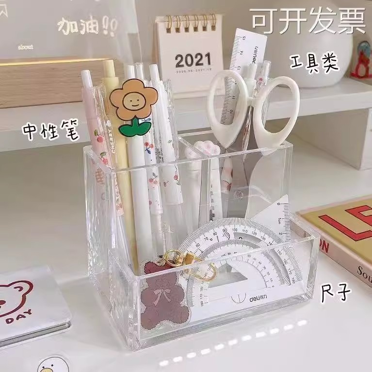 Ins風机改造-シンプルアクリル透明三格筆筒学生デスクトップ軽量贅沢多機能収納ケース