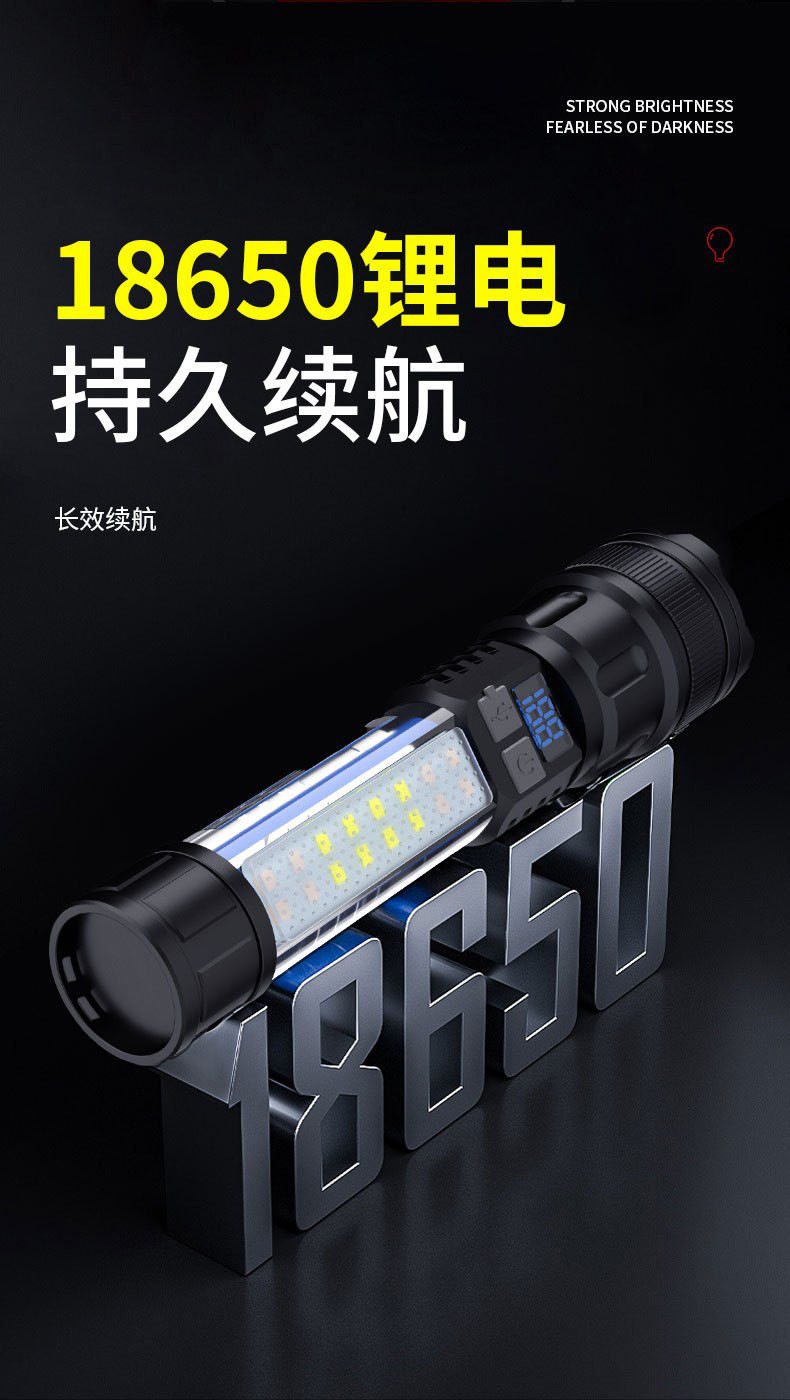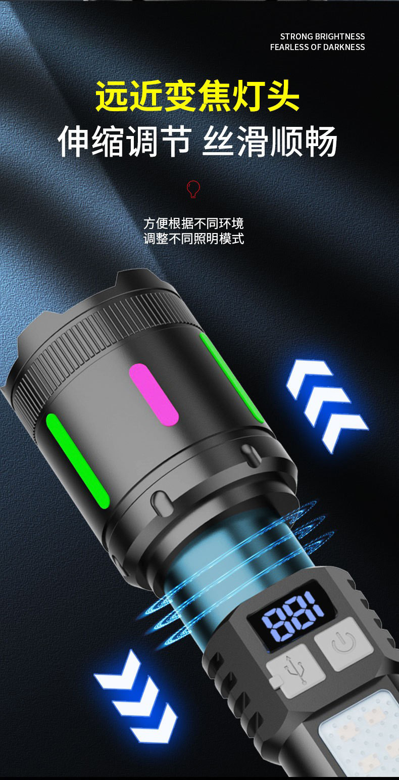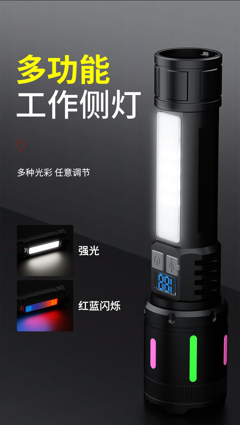 新型白レーザー超亮懐中電灯デジタル表示電力量ABS軽量伸縮ズーム赤青警報緊急サイドライト