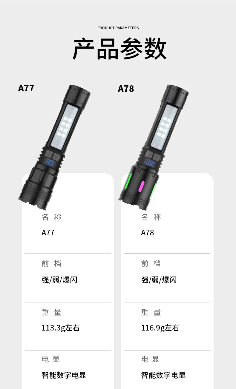 カラー A77デジタル表示懐中電灯 (アルミヘッド側灯データ線),A78デジタル表示懐中電灯 (アルミヘッド側灯データ線)