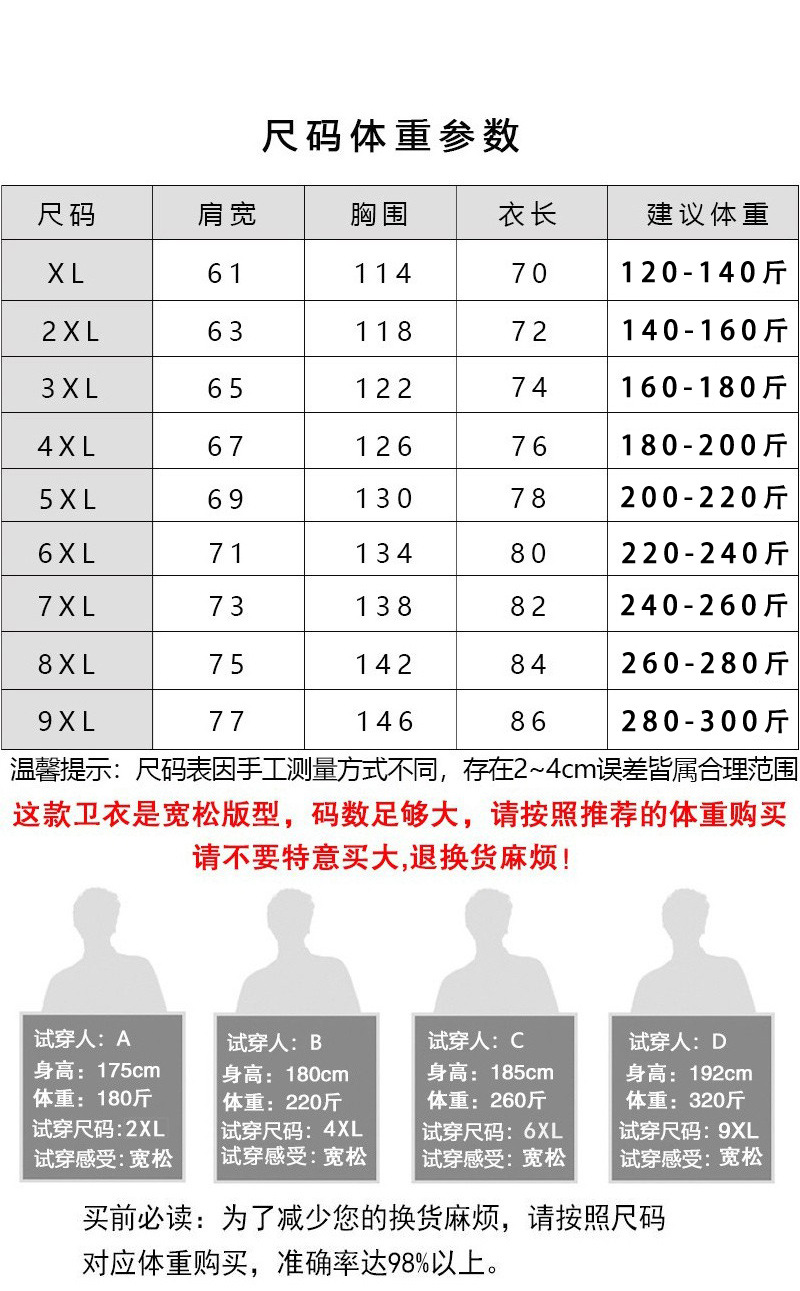 XL( 60-70kg ),2XL( 70-80kg ),3XL( 80-90kg ),4XL( 40-100kg ),5XL( 100-110kg ),6XL( 110-120kg ),7XL( 120-130kg ),8XL( 130-140kg ),9XL( 140-150kg )
