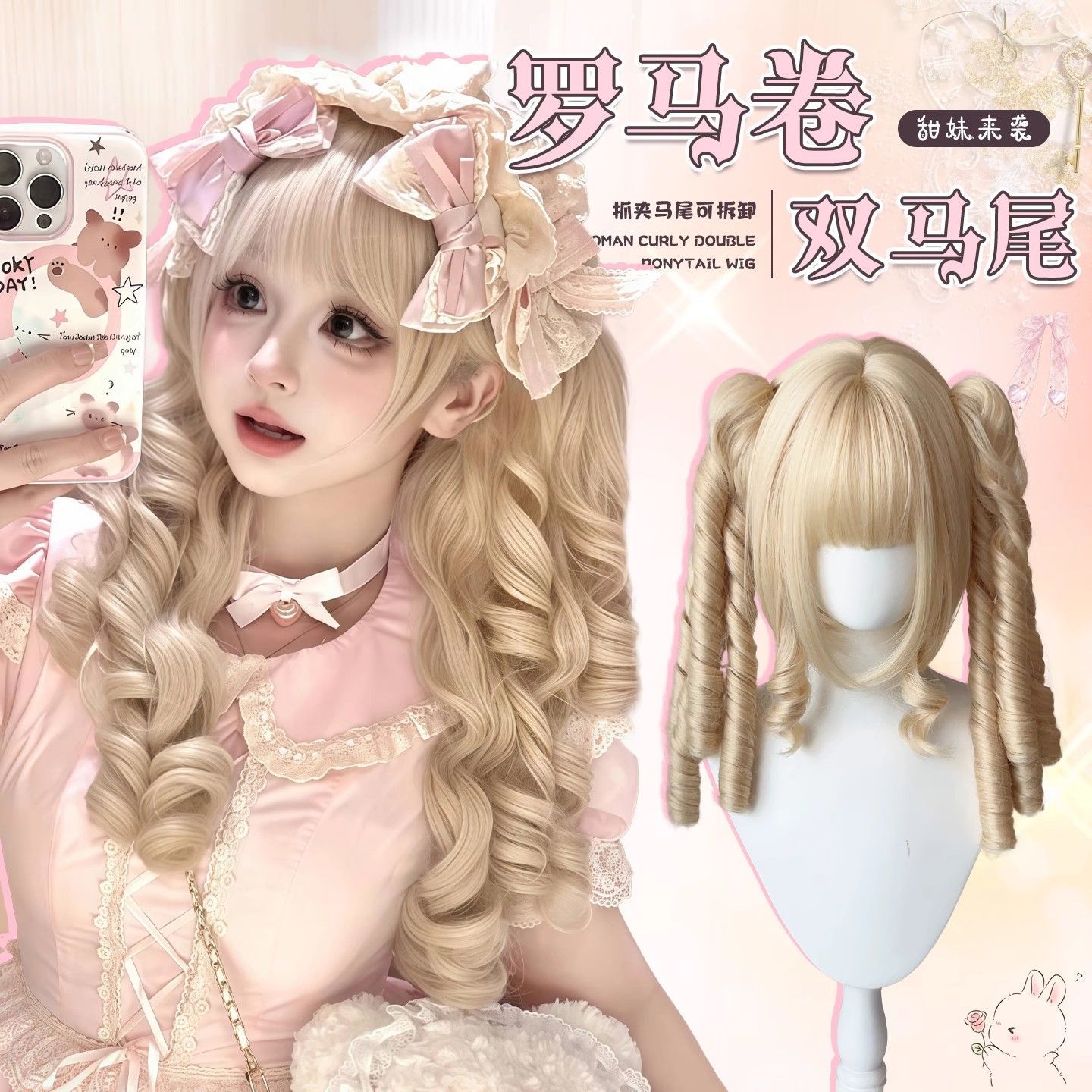 女性用ウィッグ ロリータ ダブルポニーテール 取り外し可能なローマンカーリー前髪付き 二次元 ソフトでかわいい甘い女の子 フルヘッドギア