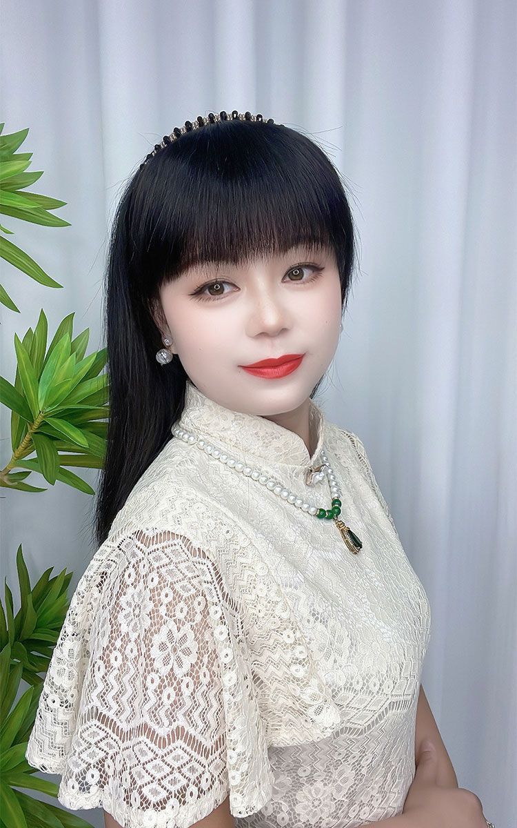 かつらの八の字の前髪の女性の頭の上の全真の髪は顔を修理します。