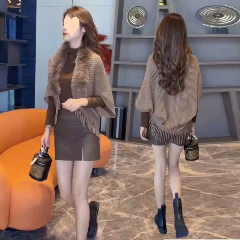 2025秋季新韩版百搭女士披肩斗篷款外套时尚毛领毛衣针织开衫外搭