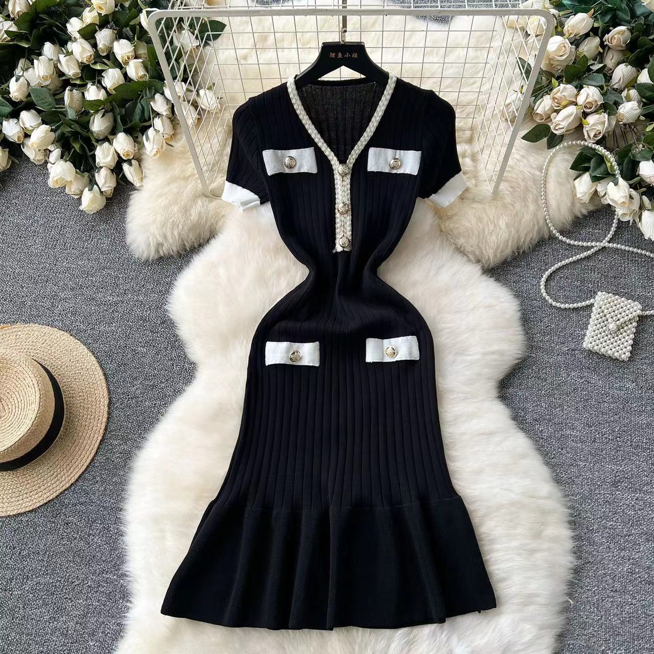 Vネックの魚の尾のワンピースの女性の夏服の2026年の新型のニットの黒色の気質は腰を収めてやせているデザイン感のスカートを現します。