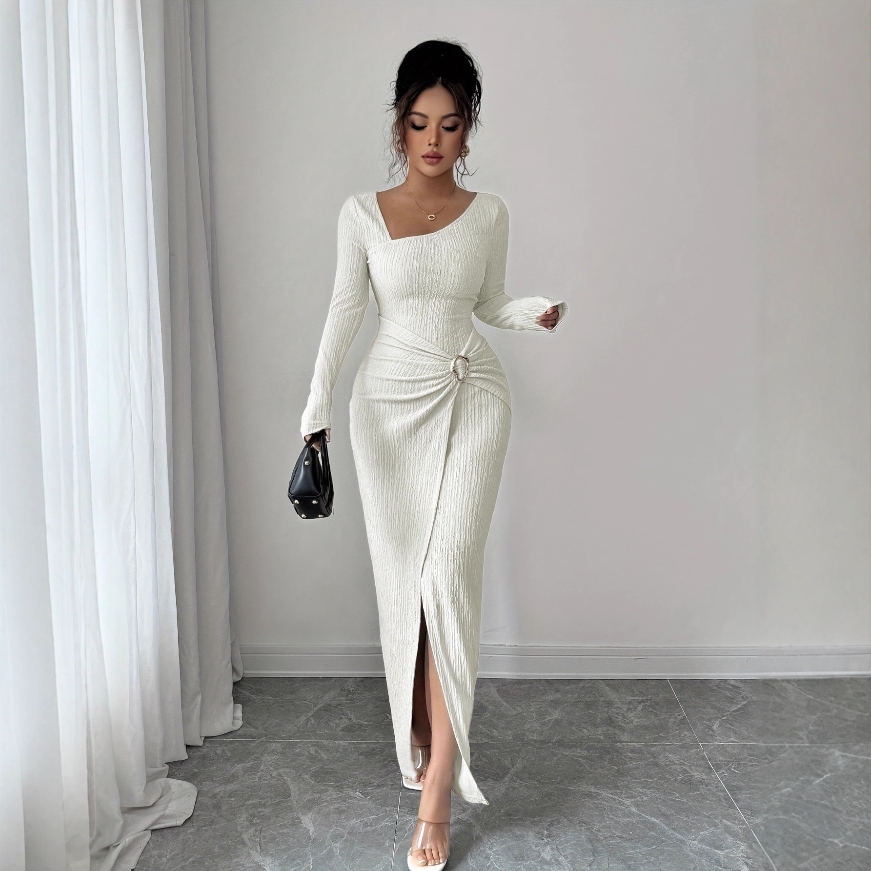 女士纯色时尚纯色扭纹长裙,不对称领口针织纹理紧身连衣裙,扭纹