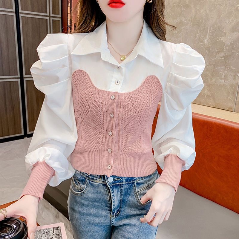韓国版百合通勤ファッション気質シフォンの泡袖は長袖の上着の女性をつなぎ合わせます。