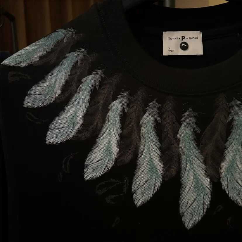 2024夏百合半袖欧米トレンド新型羽羽プリント男性ファッション丸襟ゆるいtシャツ