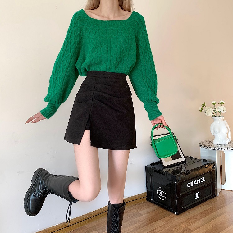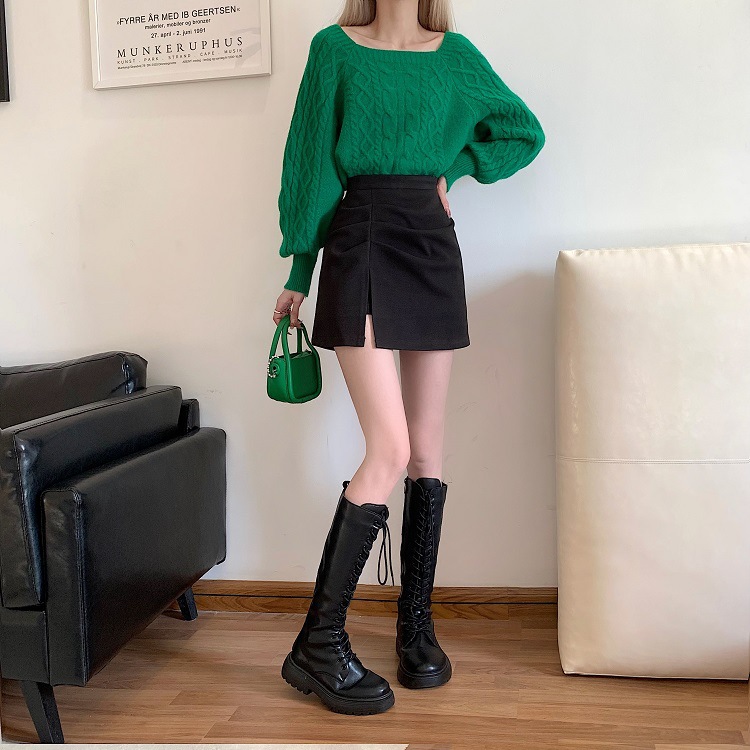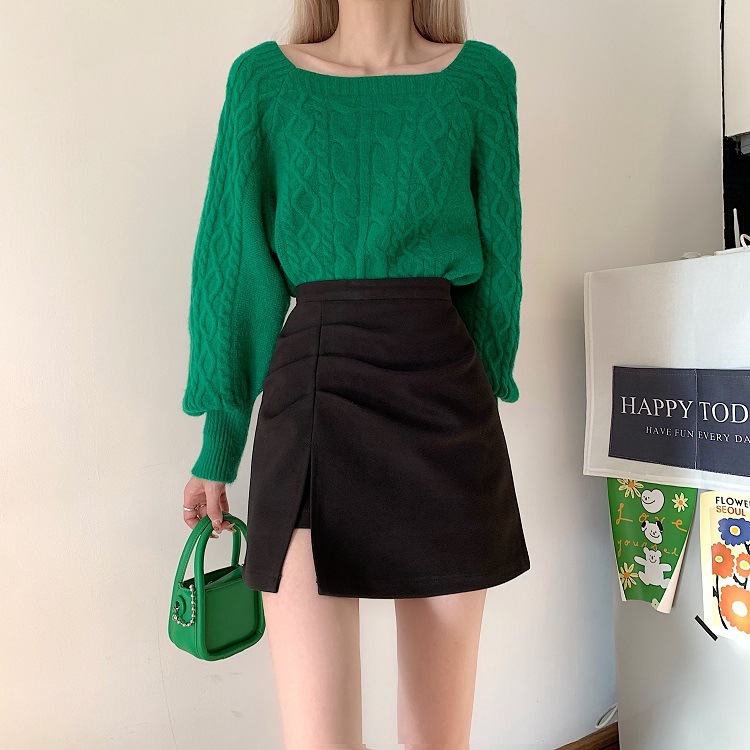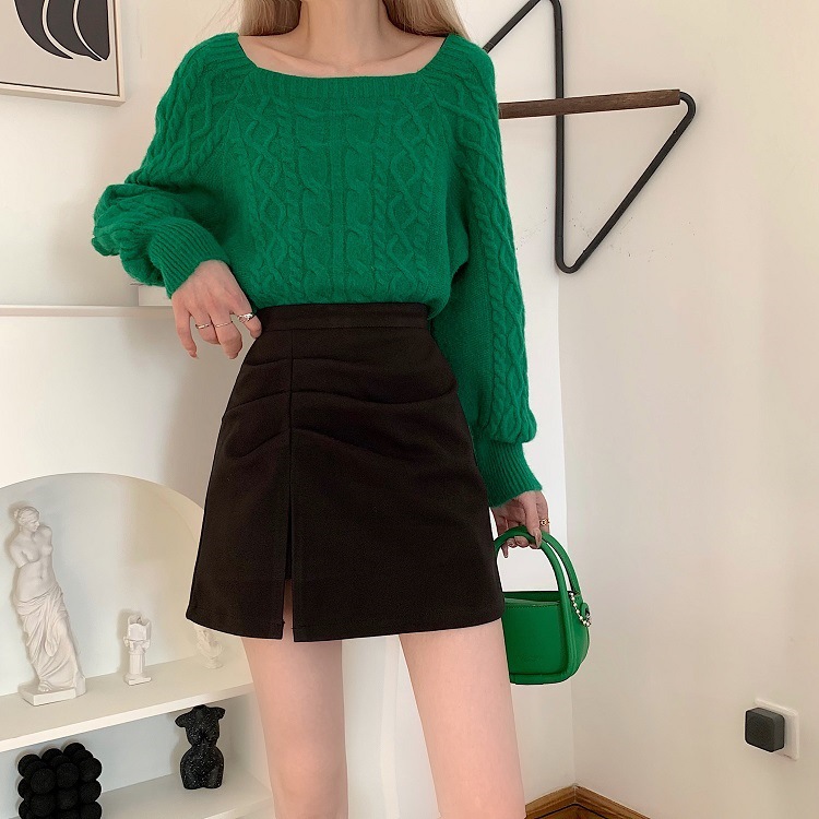 洋梨体型のぽっちゃりさん向け、黒のウール素材のハイウエストAラインスカート。スリット入りでヒップを包み込むデザインで、秋にぴったりの着痩せ効果のあるショートスカート。