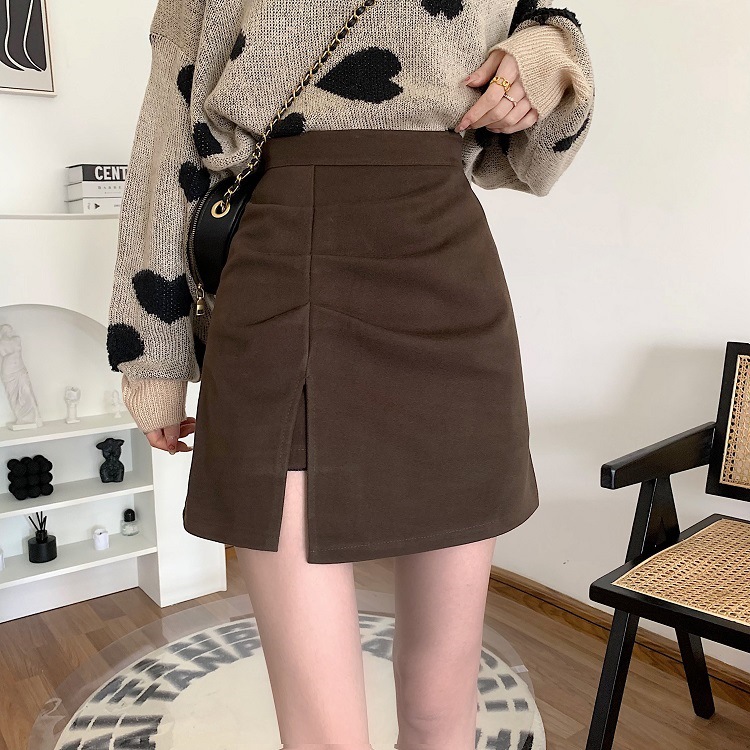 大きいサイズのカレー色の毛の半身のスカートの女性の秋冬の2024年のa字の短いスカートは股を遮ってお尻の傘のスカートの高い腰の百倍のスカートを包みます。