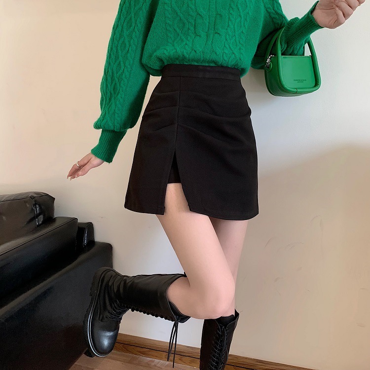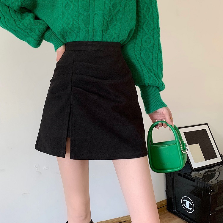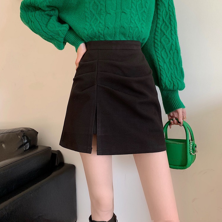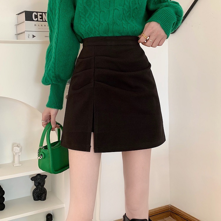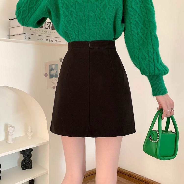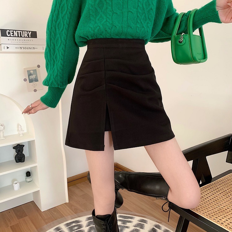 大きいサイズの太ったmmの毛はa字の半身のスカートの女性の秋の2024の新型の黒色の腰の小さい背はお尻の短いスカートを包みます。