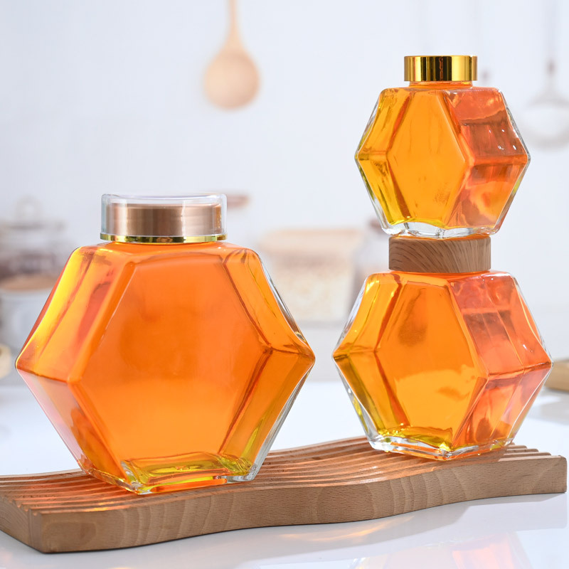 送料無料密封された漏れ防止蜂蜜ボトル六角形ガラス増粘蜂蜜ボトルガラスボトル蓋付き保存瓶