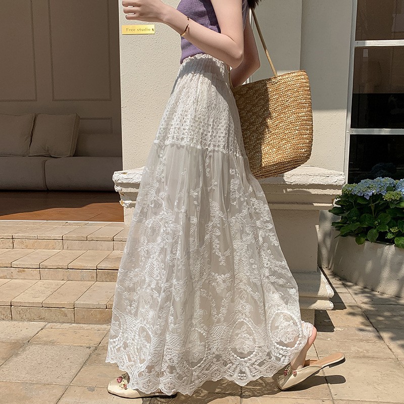 レースメッシュスカートレディース夏薄いハイウエストスリム気質カジュアル大きな裾Aラインスカートロングスカート