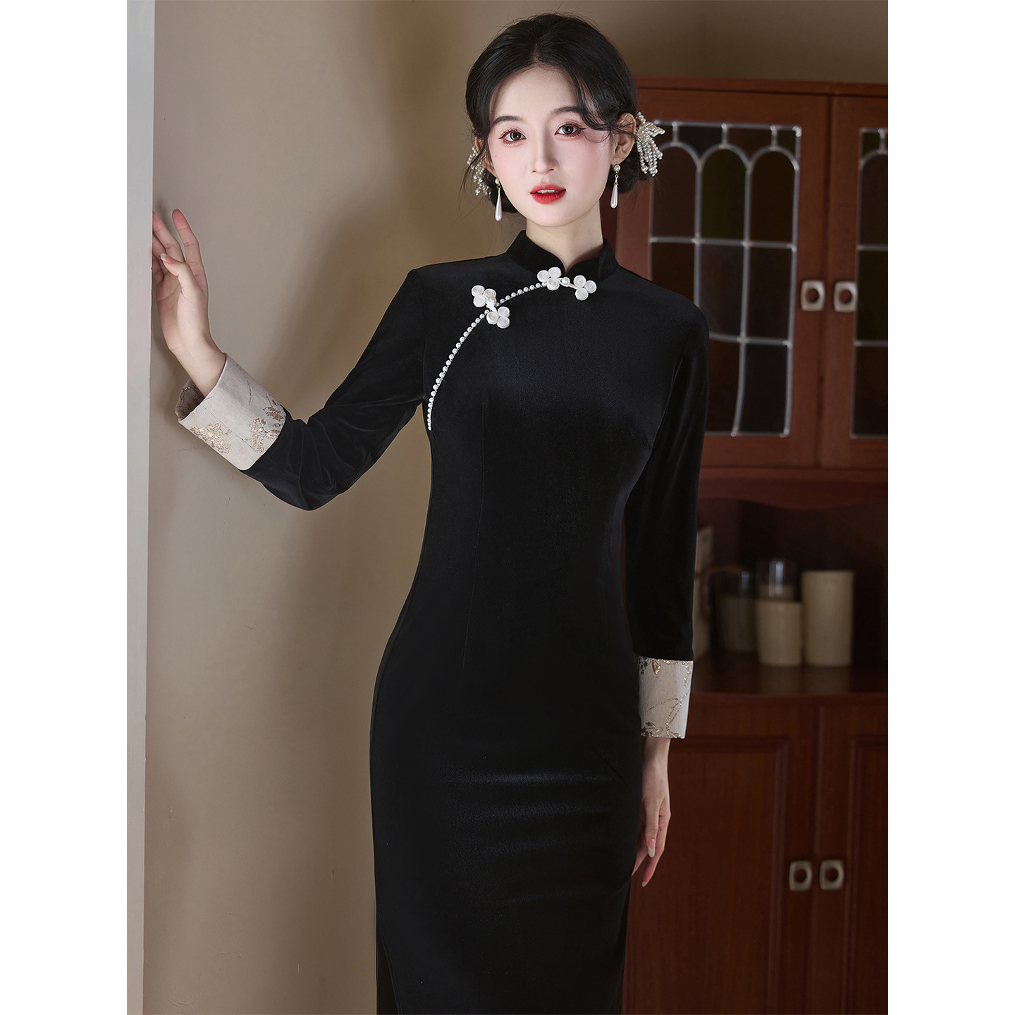 刺繍入り黒ベルベット中国風新中式オーディ秋長袖旗袍改良版女性高級感ワンピース春秋
