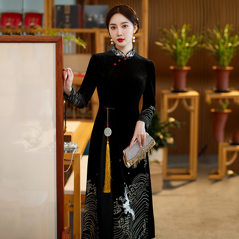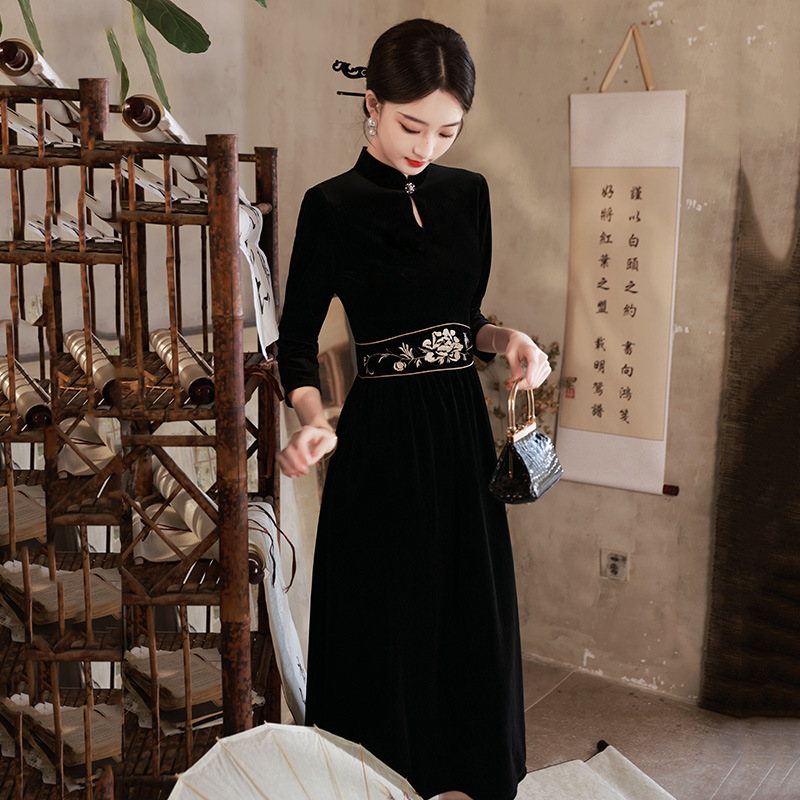 刺繍の黒いベルベットがやせている奥黛母国風中国式改良チャイナドレス女性レトロ長袖ワンピース秋冬