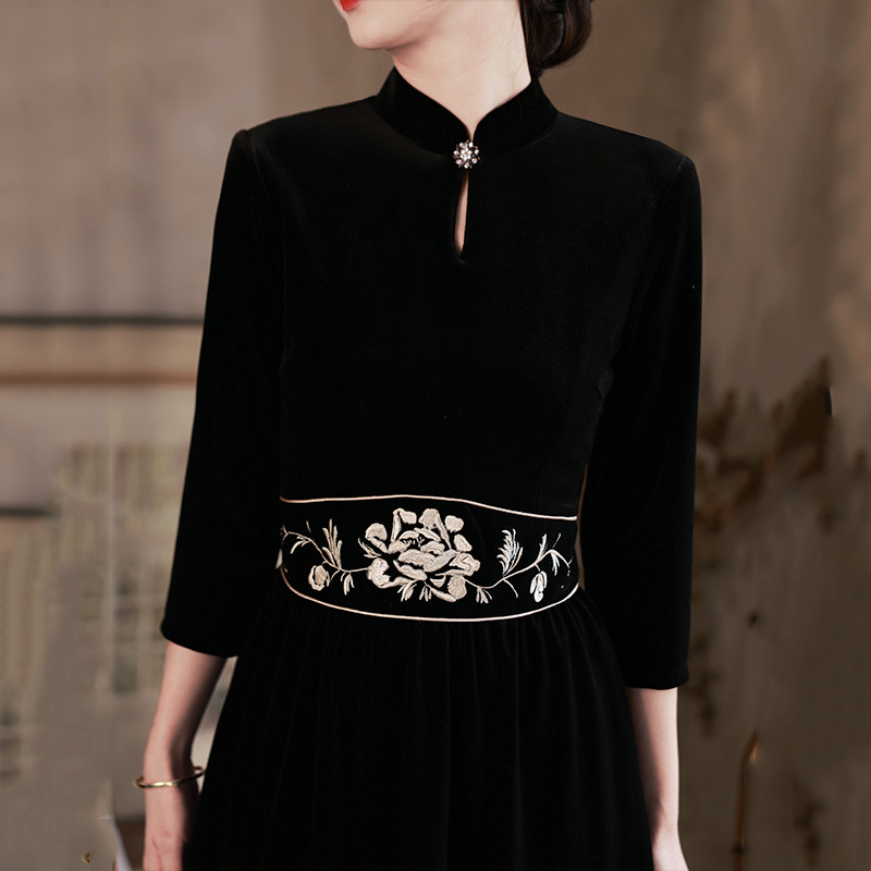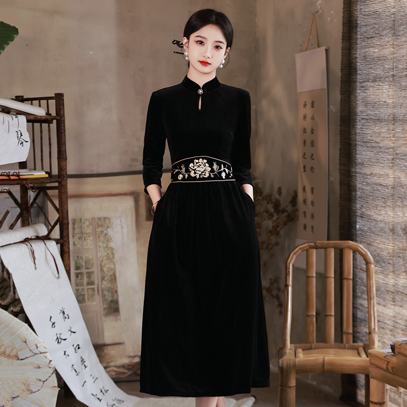 刺繍入り黒ベルベット中国風新中式秋長袖改良旗袍女性用高級感レトロワンピース秋冬