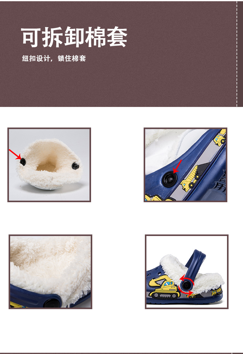 国境を越えた子供用裏起毛穴あきシューズ卸売、男の子と女の子向け、取り外し可能な可愛い漫画の掘削機柄、厚手の綿スリッパ