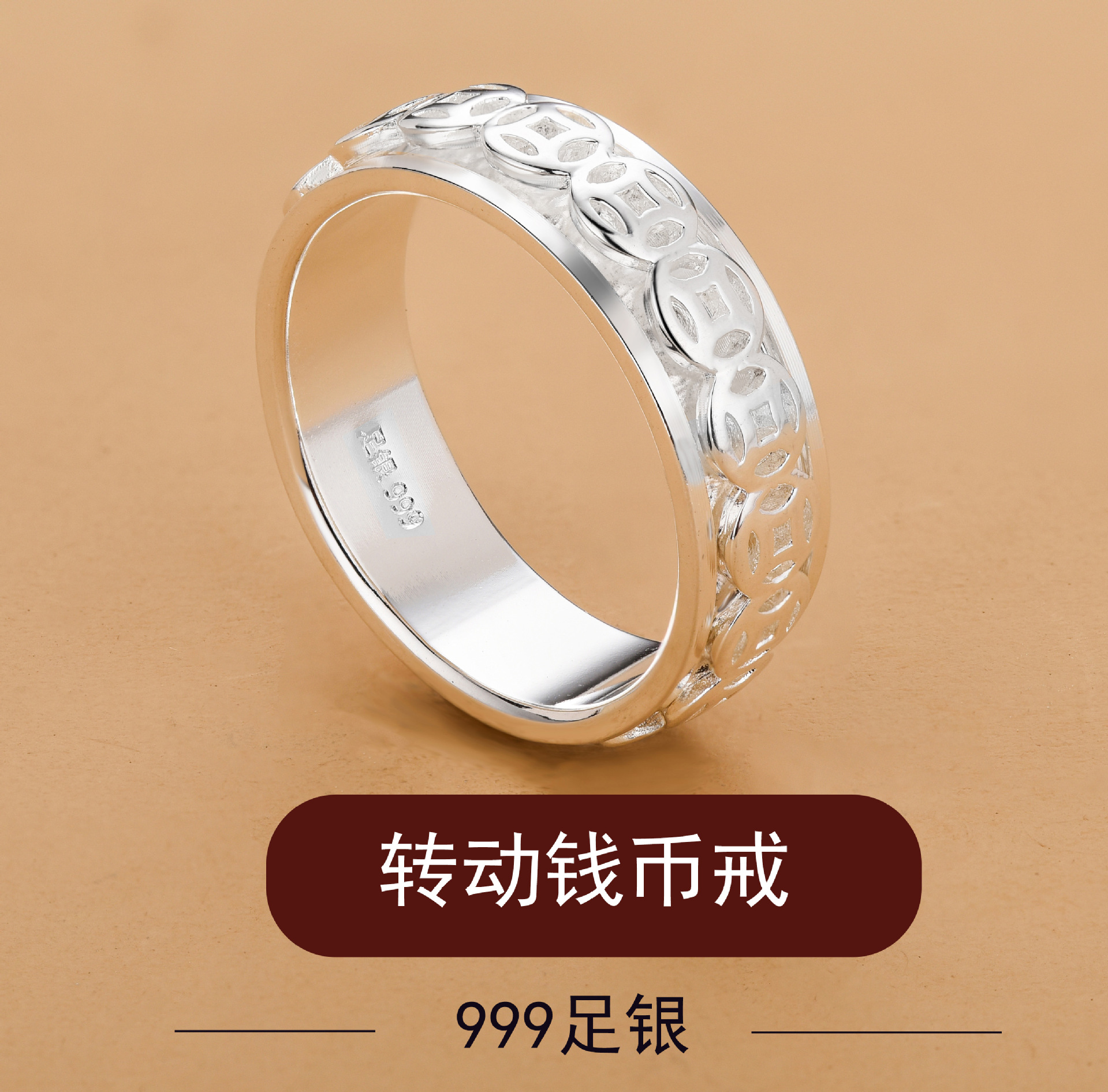 S999纯银可转动古钱金钱币食指指环戒解压招财男女款个性生日礼物