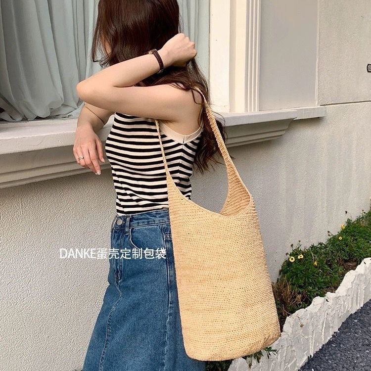 夏のラフィアバッグ、編みバッグ、女性用新作ハンドバッグ、草編みバッグ、休暇用ビーチバッグ、ショルダーバッグ、バケツ型バッグ、草バッグ
