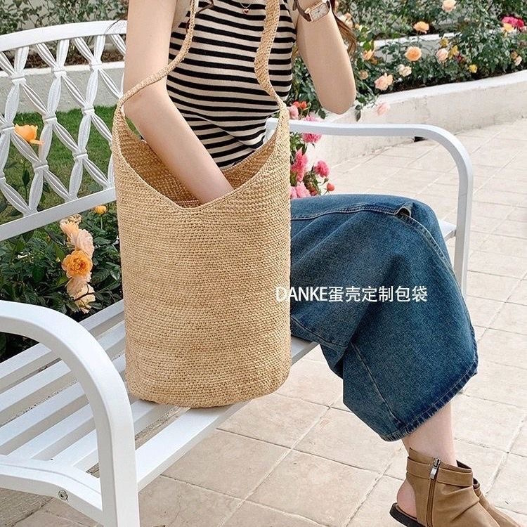 フランス式拉菲草手編みバケツバッグ観光休暇シングル肩手提げ草編みバッグ2025新作