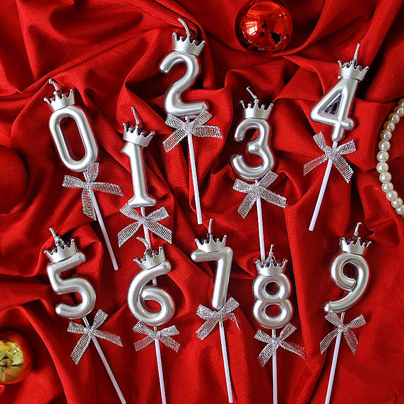 Insネットの赤いケーキの装飾の王冠の蝶結びの数字のろうそくの銀色の0-9の子供の王冠の誕生日のろうそく