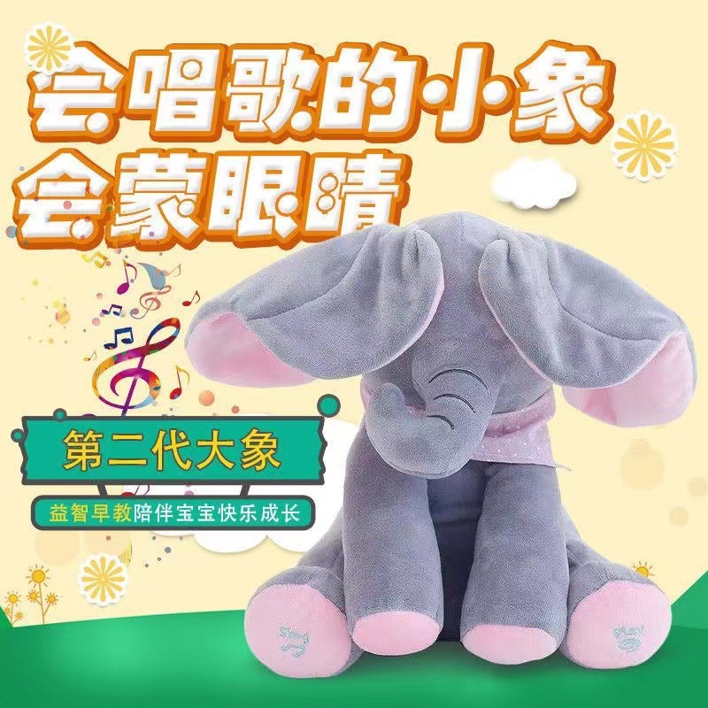 国境を越えて猫の象が舞い上がる象の電動ぬいぐるみの子供が人形をなだめて恥ずかしがり屋が目を覆っている象