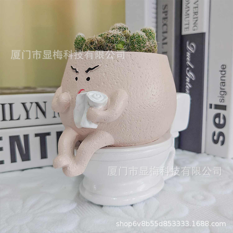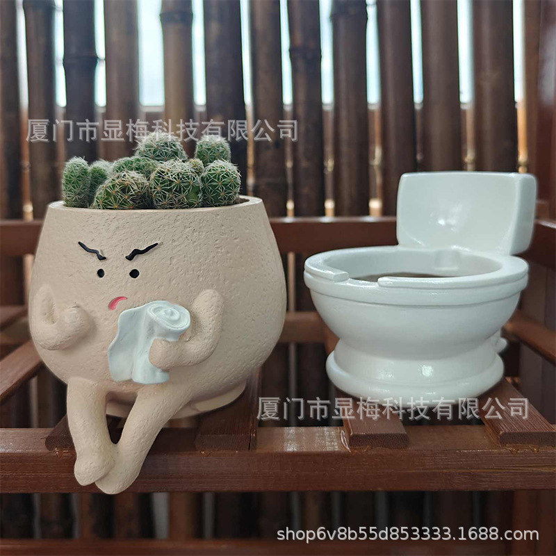 跨境卷纸小鬼马桶多肉花盆办公室书房装饰可爱户外庭院绿植摆件