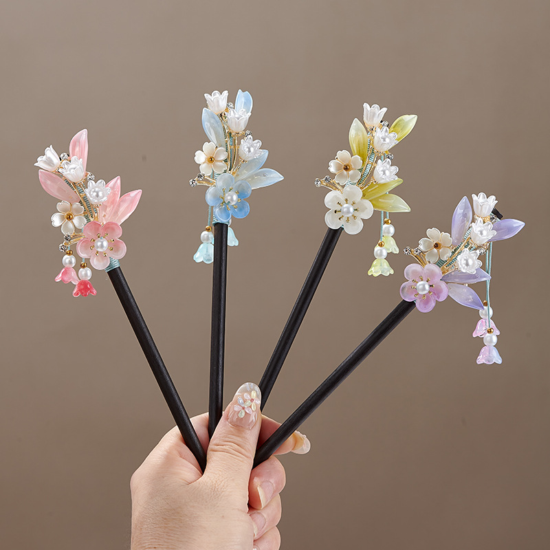 小清新花朵古风流苏发簪新中式仿黑檀木盘发簪子古装旗袍配饰木簪
