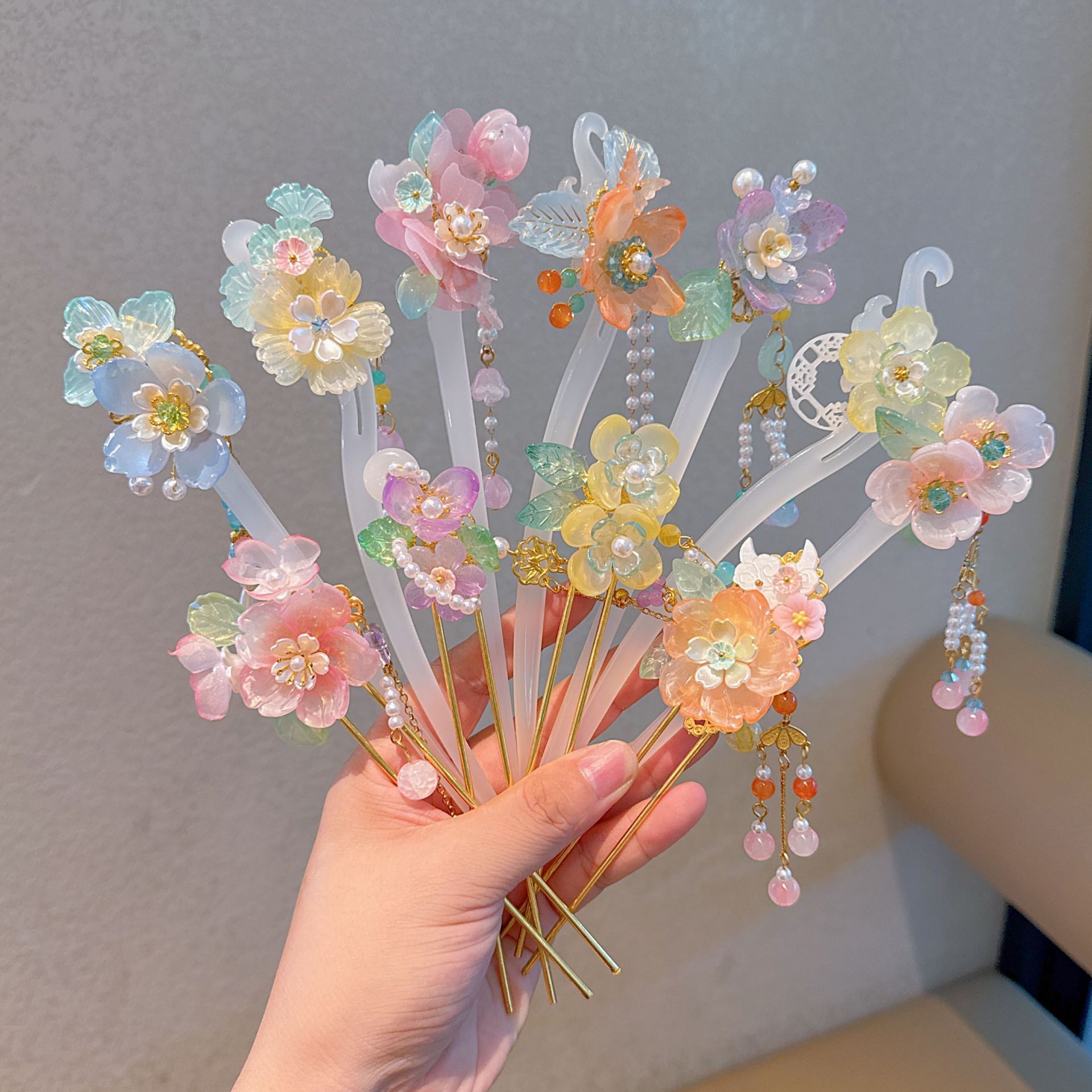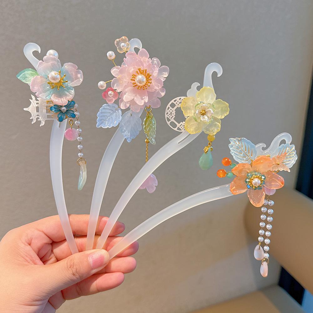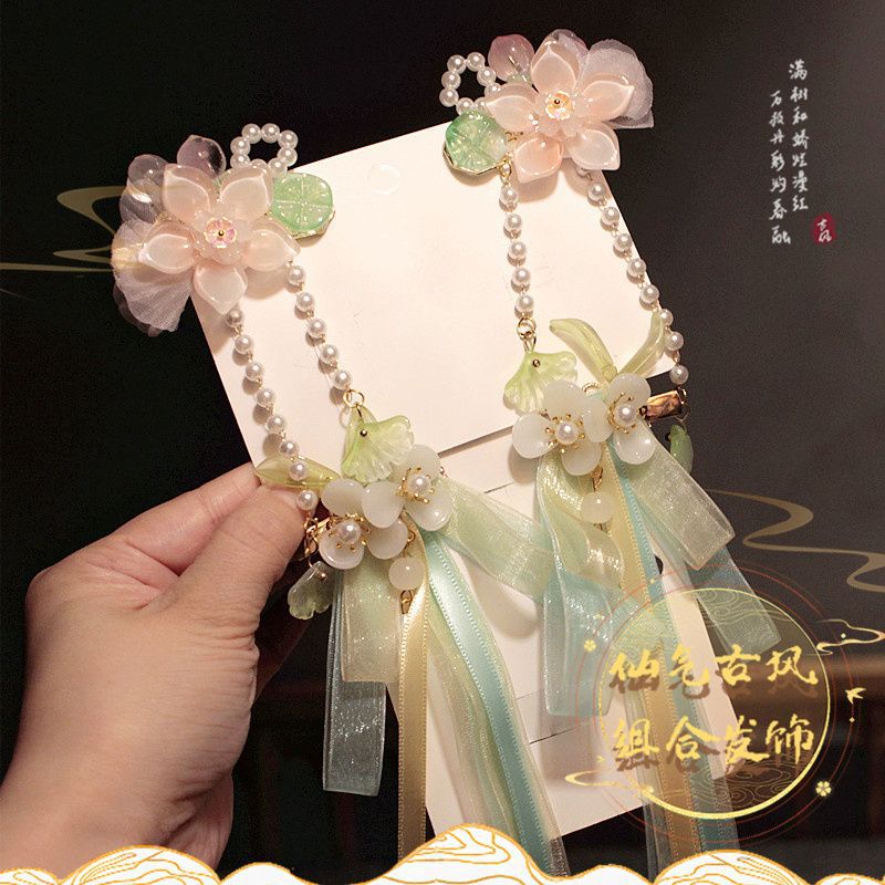 漢服の頭飾り真珠の花のかんざしセットの女の子の古風な服装の装飾品の2024春の新型の古典的な髪飾り