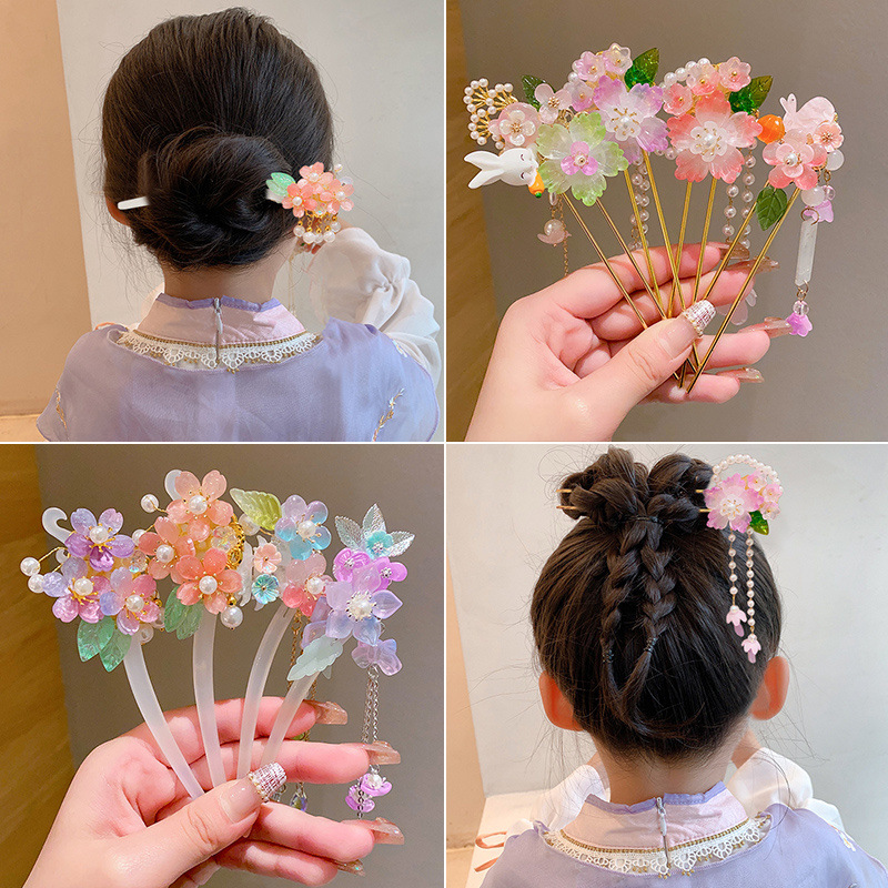 子供用漢服ヘアアクセサリー、新年古風タッセルヘアピン、女の子用超仙風歩揺るヘアピン、古装アクセサリー、子供用舞台衣装ヘアアクセサリー