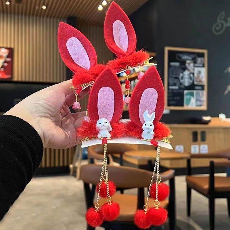中国の古風な贈り物のヘアピンの子供のかわいいウサギの耳の髪飾りの女の子の漢服のフリンジの髪飾りのぬいぐるみ