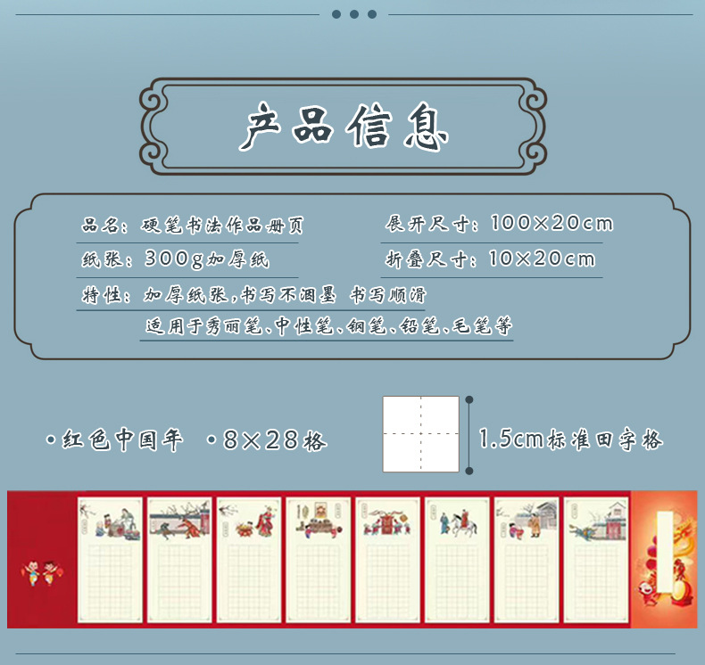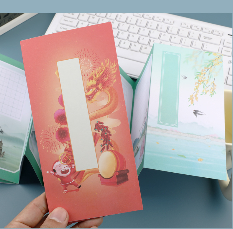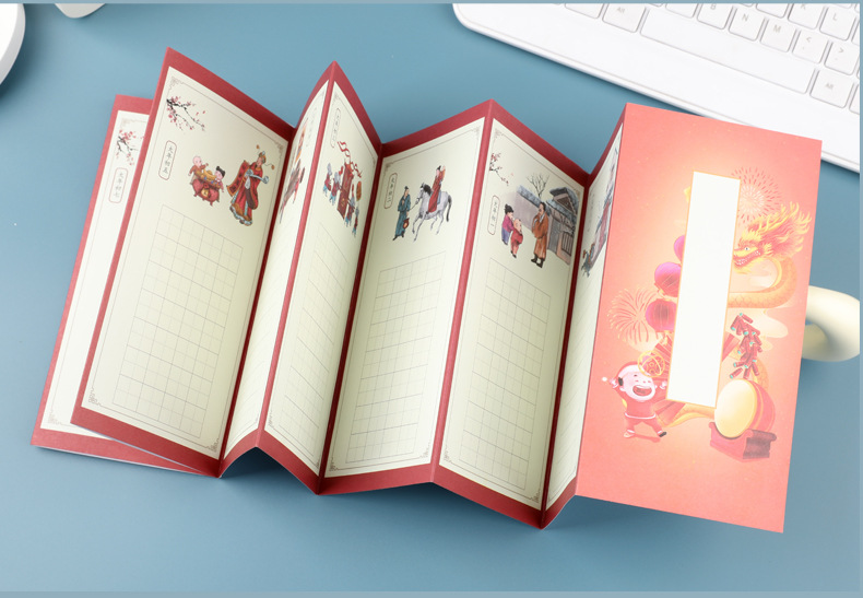 硬筆の書道の作品の紙の冊のページの折り畳みのページの古国風の学生のペンの字の古詩は長い巻きの方田格を書きます。