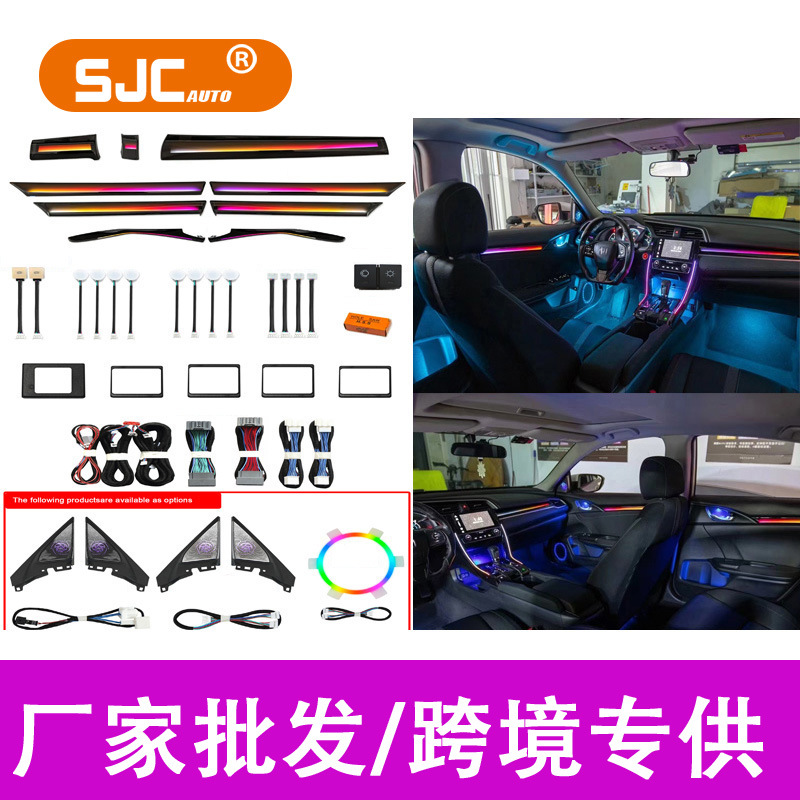 适用于十代思域安装镭雕款幻彩氛围灯,64色23灯25灯27灯,按键和手机控制,免穿线安装,采用镭雕工艺,纤维款,9件套替换原车饰板条,原车风格,多辅助功能,迎宾模式,开门提示,双闪提示,超速提示,转向提示等,律动模式,幻彩模式,光流模式,多模式选择,还可以选配钻石高音,喇叭圈,产品质量稳定,价格实惠,欢迎咨询