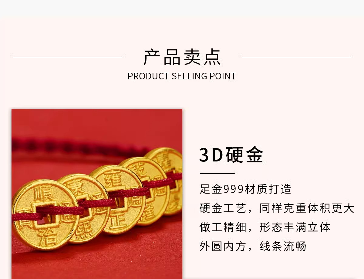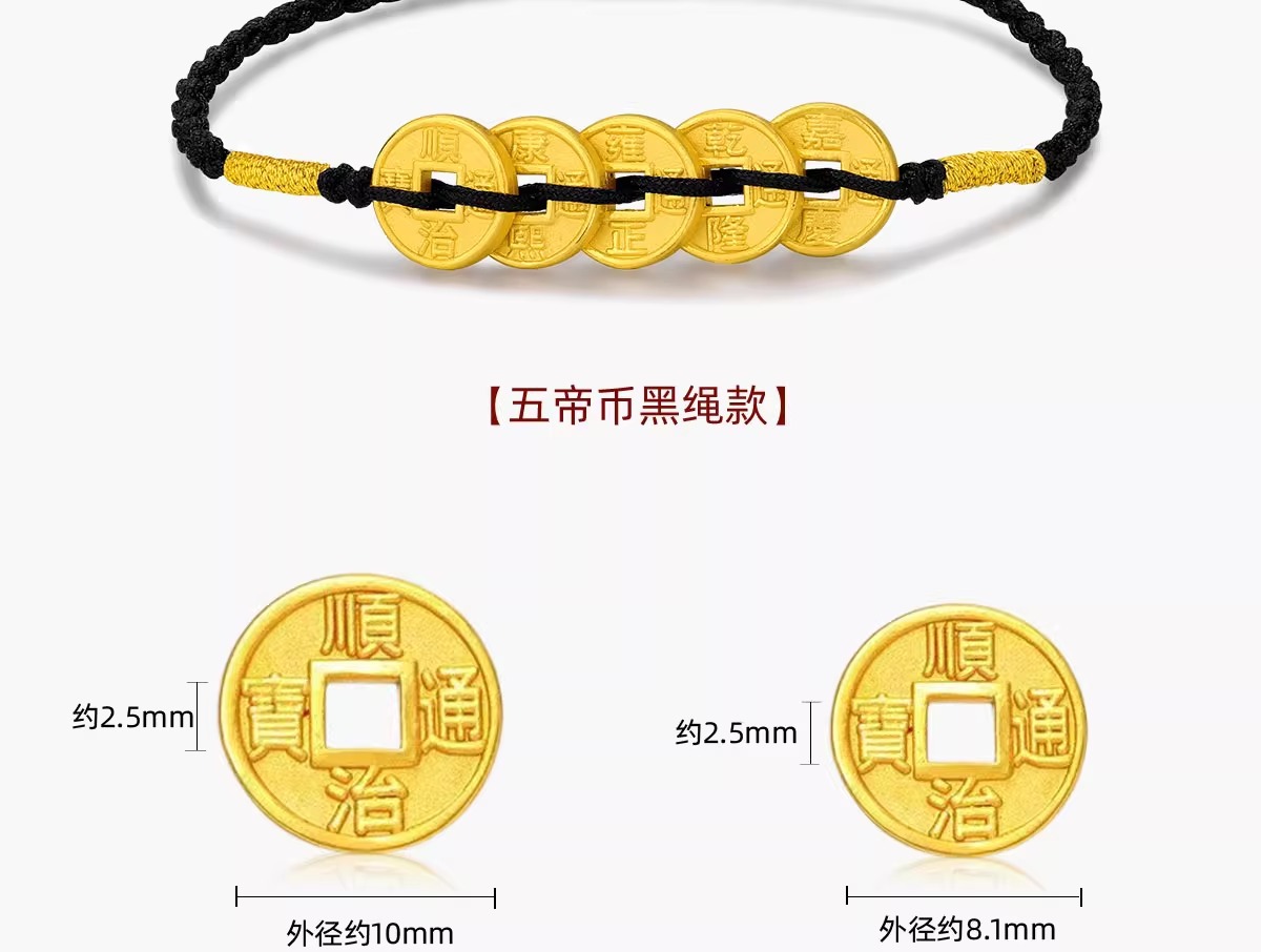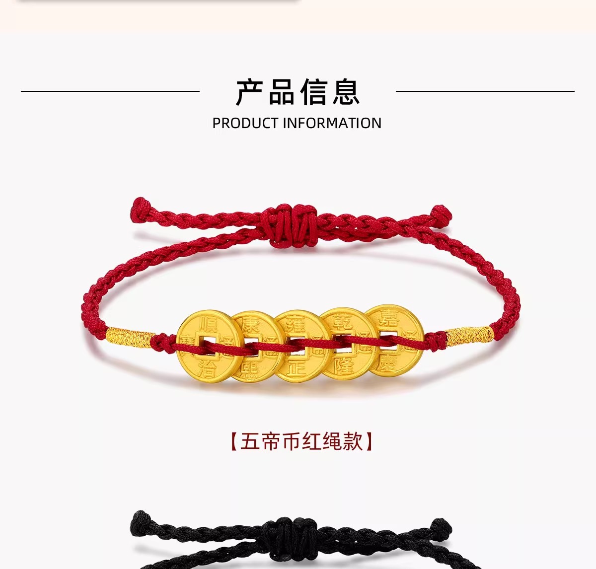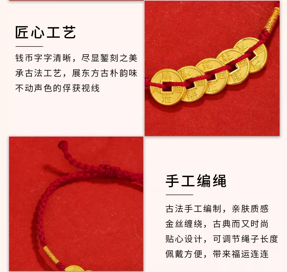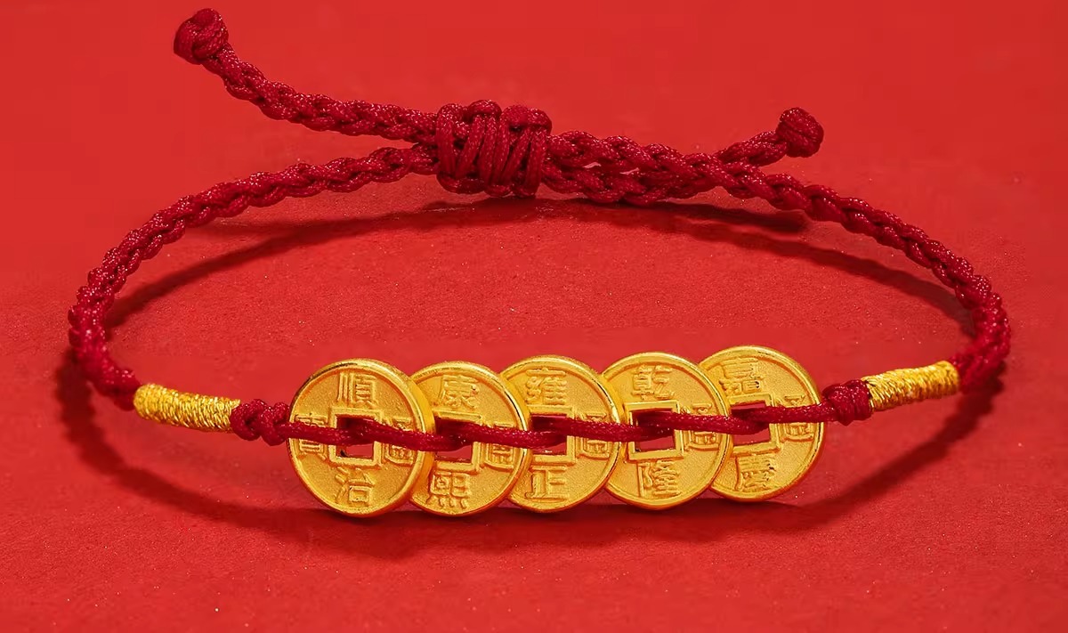 九鳳祥999純金ブレスレット金銀包金 黄金五帝銭編み込みブレスレット本命年赤紐編み込みギフト