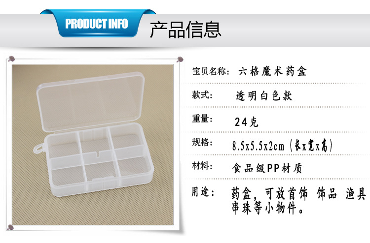 6コンパートメントプラスチック透明ピルボックスPP収納ボックス小型ポータブルプラスチック包装ボックスピルミニピルボックス