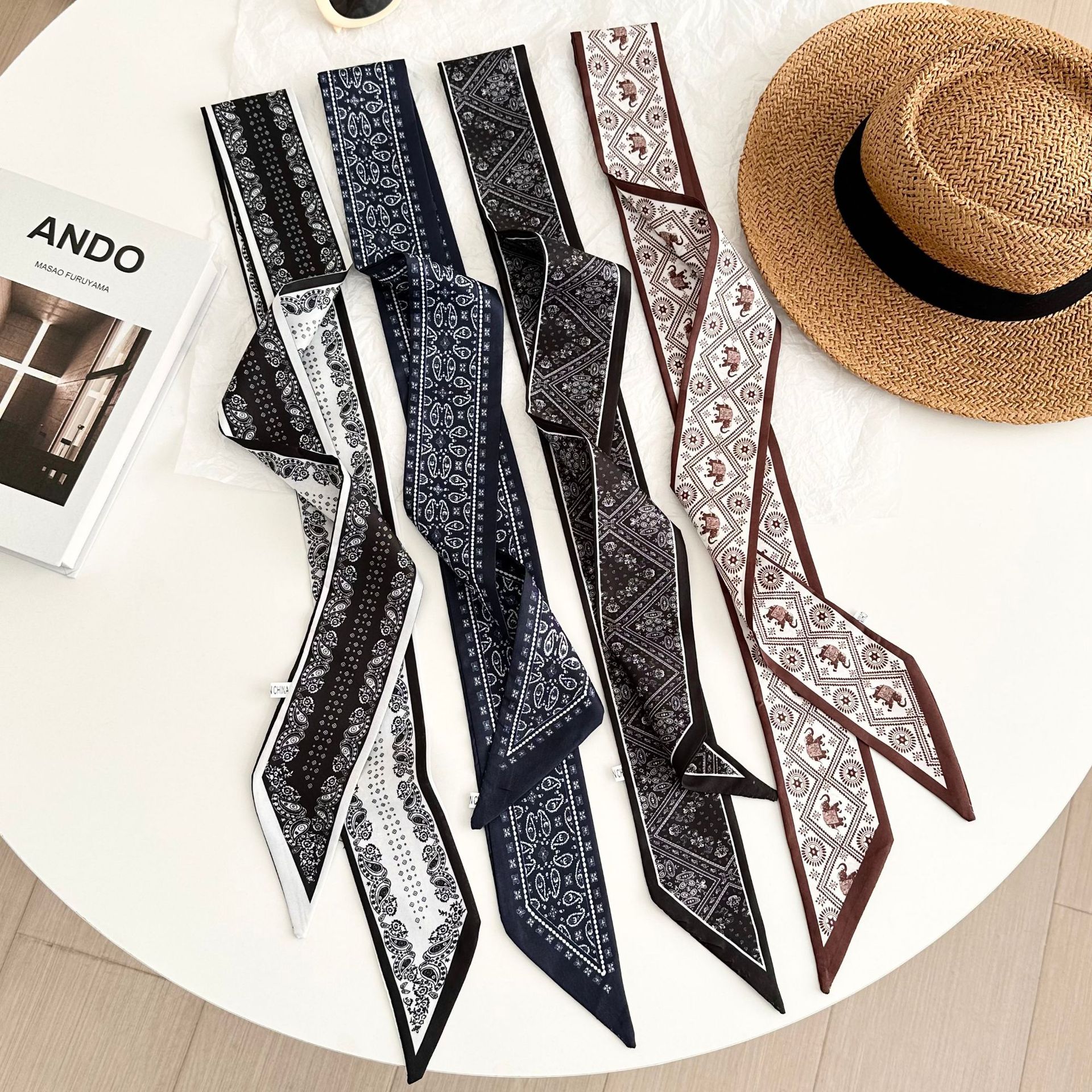 細長い小さなシルクスカーフ 2025 女性の春と夏の韓国語バージョン多用途ヘアネクタイバッグ無地カシューフラワーヘッドバンドストリーマー