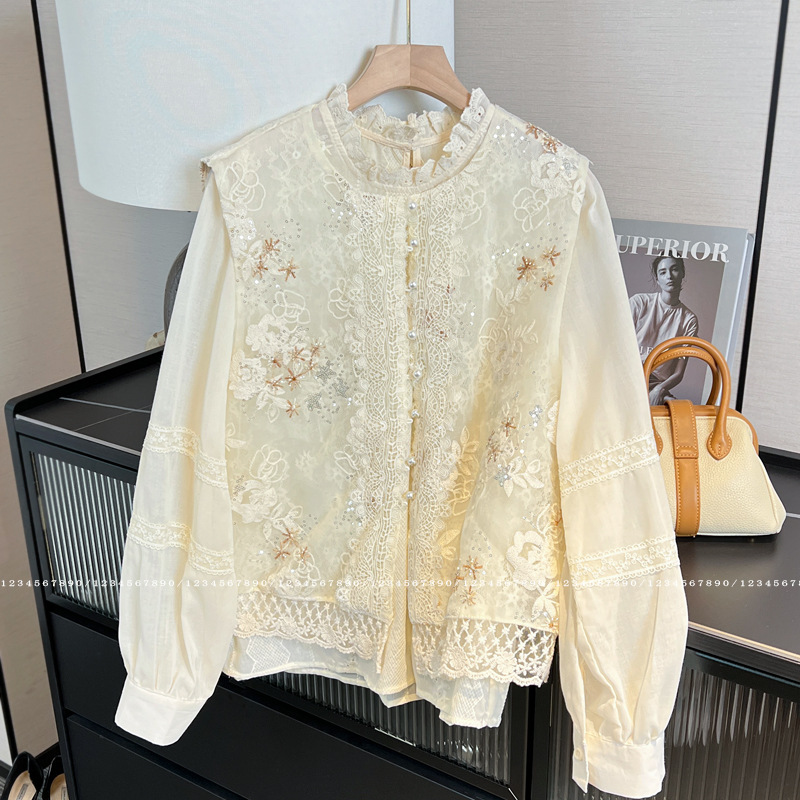 早春のフランス式の優しい風の気質の上着のスーツの2025項の新しい中国式のレースの刺繍は馬の甲のシャツの女性をつなぎ合わせます。