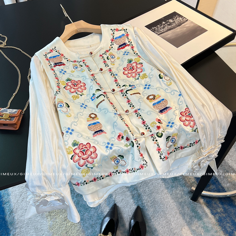 新中国式の国風のスーツの女性2025春の新型の復古刺繍の馬甲は重ねて酢酸のシャツの唐服の上着を着ます。
