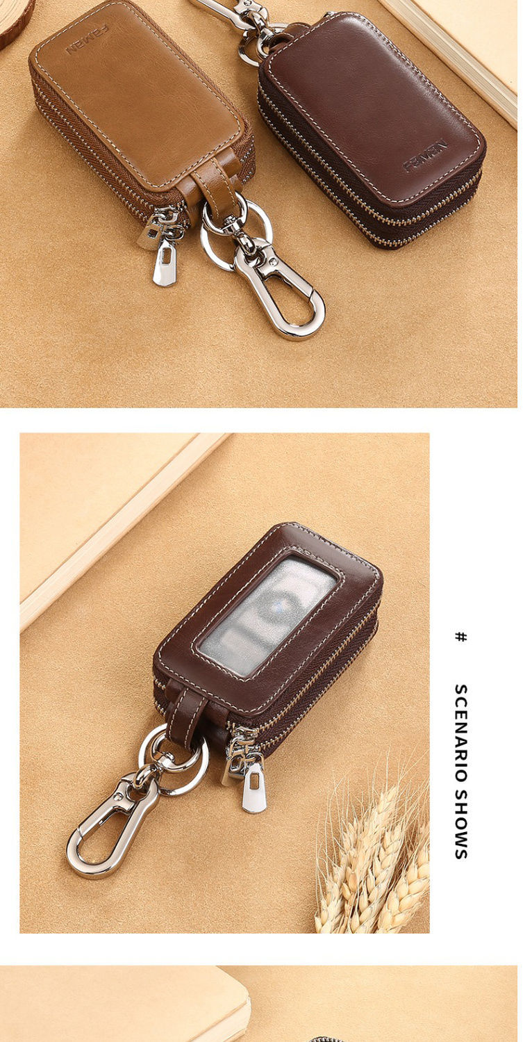 本物のソフトレザーカーキーケース、メンズダブルジッパーバッグ、レディースウエストキーバッグ、多機能家庭用キーケース収納