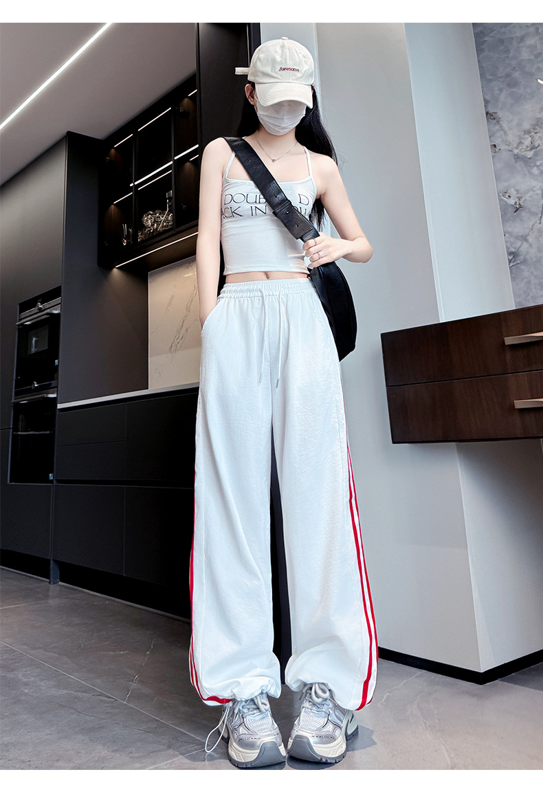 クールシルクコットンリボン付きワークパンツ レディース 2025年夏 細見え アメリカンスポーツパンツ ストレート ワイドパンツ