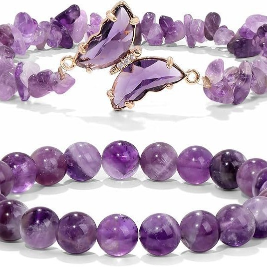 蝶の形をした天然水晶ブレスレット2点セット、天然石の女性用重ね付けイエローアメジストとパープルアメジストのビーズブレスレット