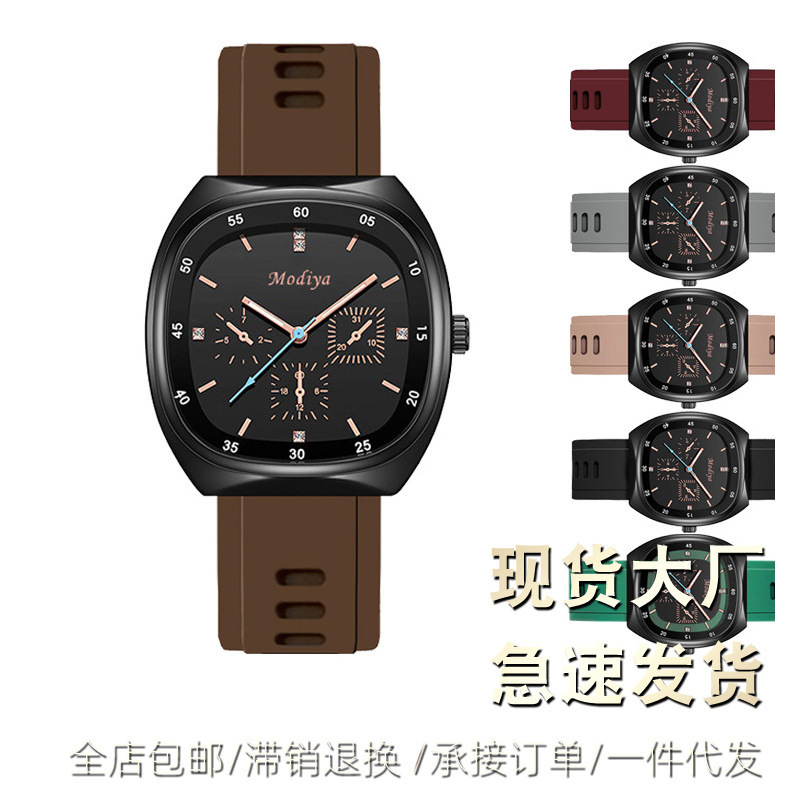 外贸爆款时尚酒桶硅胶带三眼蓝针男士手表男表石英表厂家现货批发