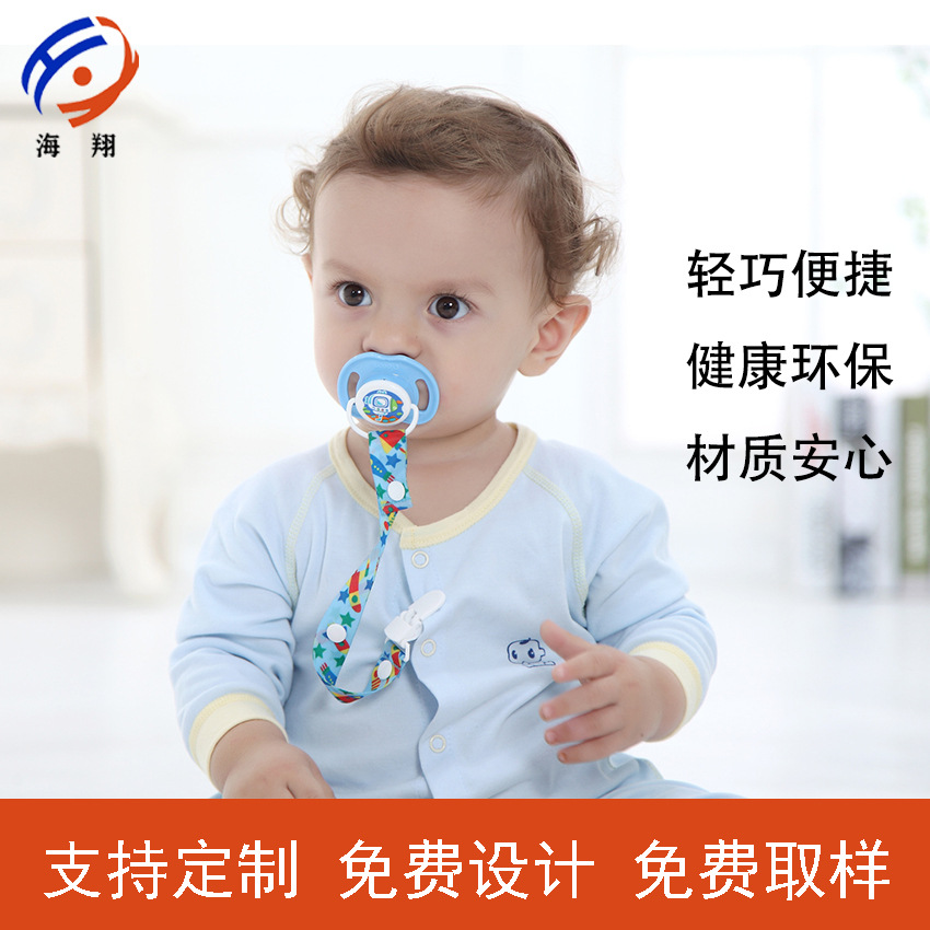 赤ちゃんがおしゃぶりのチェーンをなだめ、チェーンを落とさないようにします。
