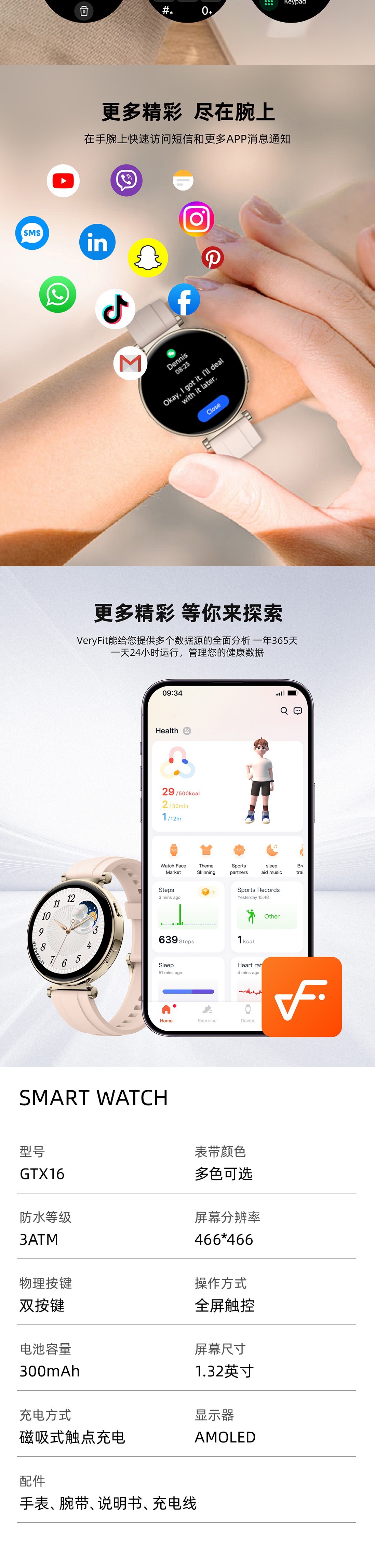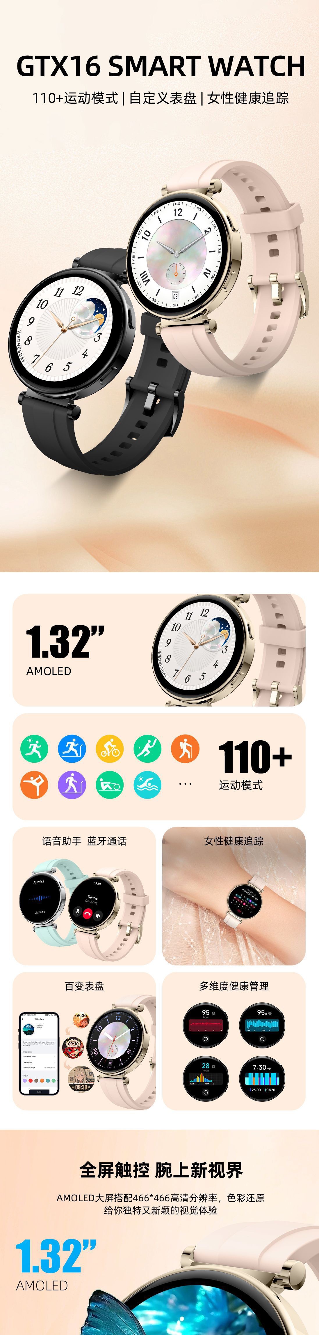 世界国境を越えた新製品GTX16 bluetooth通話知能音声アシスタント運動健康心拍数血酸素モニタリング