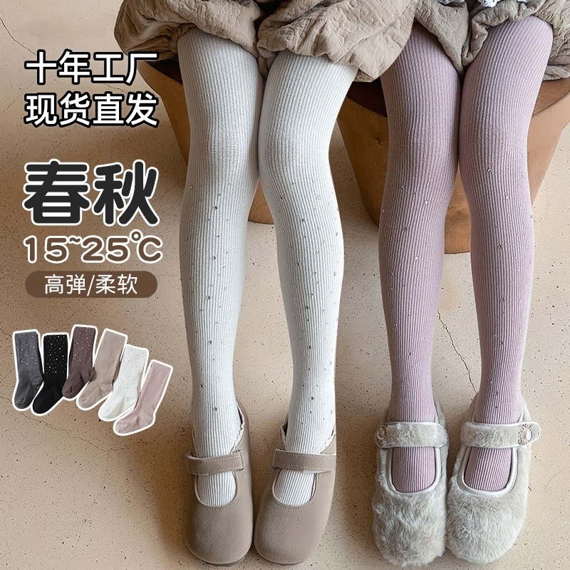 女の子用パンスト、純綿、ラインストーン付きリボン付きレギンス、春秋用ベビー秋冬用ワンピースソックス、外履き用